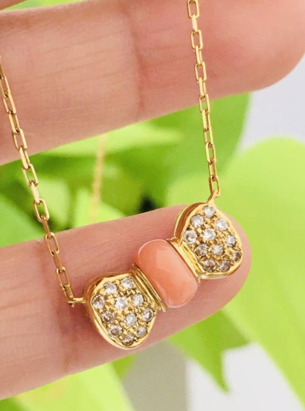 今回ご紹介するのは、**K18(18金)に天然サンゴとダイヤモンドをあしらったネックレス**。