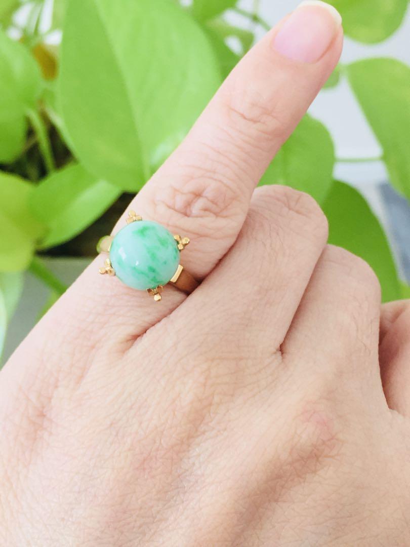 上品で魅力的なK18翡翠(ヒスイ)リングをご紹介いたします。このリングは7号のサイズで、9.5mmの翡翠が豊かな緑色で指元を美しく飾ります。翡翠はその鮮やかな色合いと神秘的な魅力で知られ、このリングはその美しさを最大限に引き立てています。翡翠の輝きは、日常の装いにエレガンスと魅力を添え、特別な日には贅沢な存在感を放ちます。指先から広がる美しさを、このK18翡翠リングでお楽しみください。